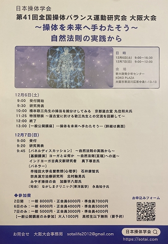 職場での操体指導者、落合久美先生が会頭なので、サボっていた操体学会に再入会。準備段階からお手伝い。久々の奈良操体の会、北村翰男先生はじめ漢方の大先輩、須永隆夫会長など、素晴らしい方々に出会い、久美ちゃん任せにせず、もうちょっと精進せな、と痛感。2日目のパネルディスカッションではモデレーターの大任を任され、言いたい放題。貴重講演、インドヨーガの研究者、真下尊吉先生による、「ヨーガとは何か-自然法則(至福)への道-」はサンスクリット原典から読み込まれたご発表で、学位論文級かと感じました。子供達への指導もあり、和やかに、112人の参加者にご満足いただけたかと思います。